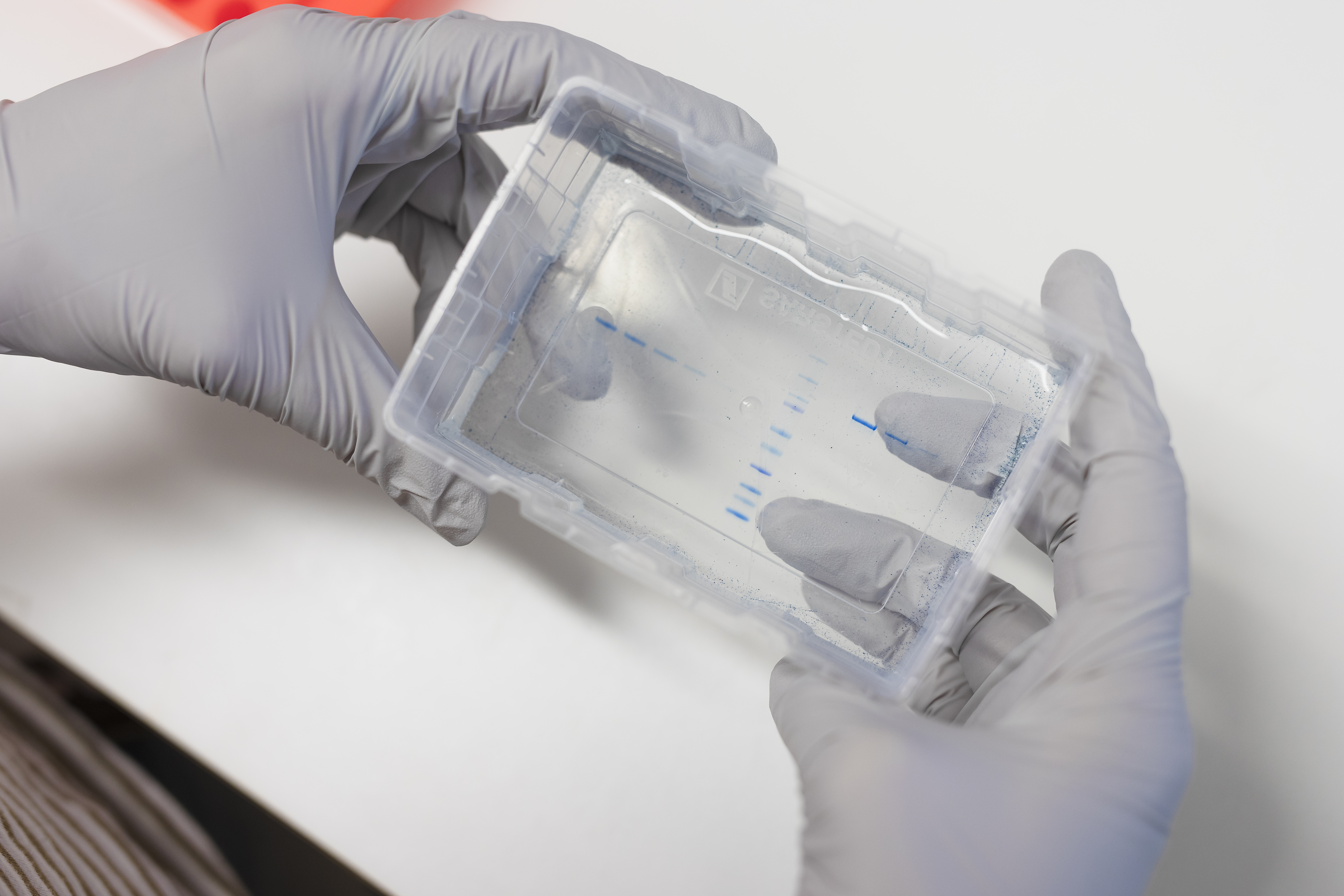 Bildtext: Bilden visar hur proteiner görs synliga i en gel efter att ha isolerats från celler.