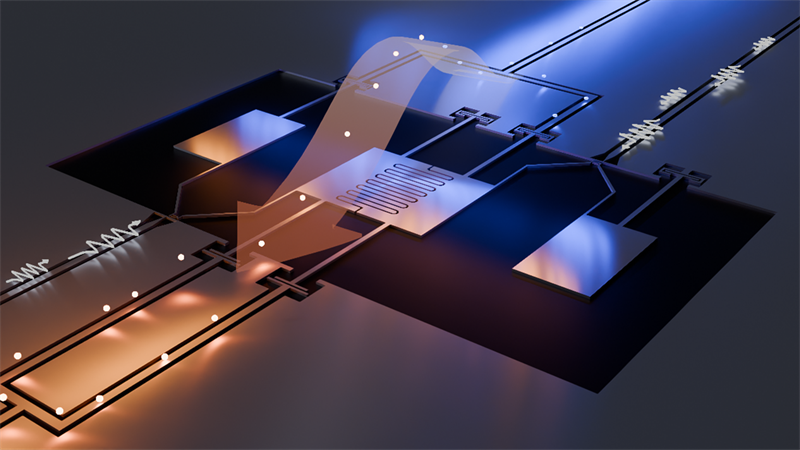 Bildtext: Schematisk illustration av kvantkylen i en supraledande kvantkrets.Två mikrovågskanaler fungerar som varm (rödtonad) och kall (blåtonad) värmereservoar och är kopplade via en artificiell molekyl som består av två kvantbitar. Kontrollerat mikrovågsbrus (vita sicksack-pilar) matas in via sidportarna för att driva och styra värmetransporten. Den breda pilen visar värmelflödet från från kallt till varmt. Illustration: Chalmers tekniska högskola / Simon Sundelin