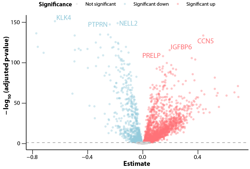 Bildtext: Denna ”volcano plot” belyser ålderns inverkan på plasmaproteomet och visar många proteiner med betydande åldersrelaterade förändringar. Varje punkt representerar ett protein, där rött indikerar proteiner som ökar och blått indikerar proteiner som minskar från barndom till vuxen ålder.